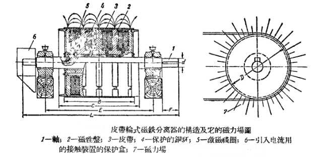 在皮帶輪式分離器內(nèi),沿著輪子的轉(zhuǎn)動其表面會產(chǎn)生強大的磁場,在較小直徑處的磁場達到750-900奧斯特,較大直徑處磁場達到1200-1400奧斯特,當即將進行球磨機粉碎的物料內(nèi)金屬塊落到這個磁場時,就會被吸進并貼在筒上,然后脫落而被皮帶擲落到分離器下方的特殊卸斗內(nèi)。其具體結(jié)構(gòu)如圖: